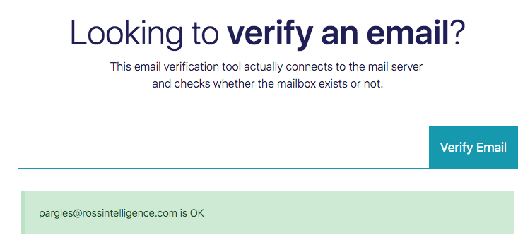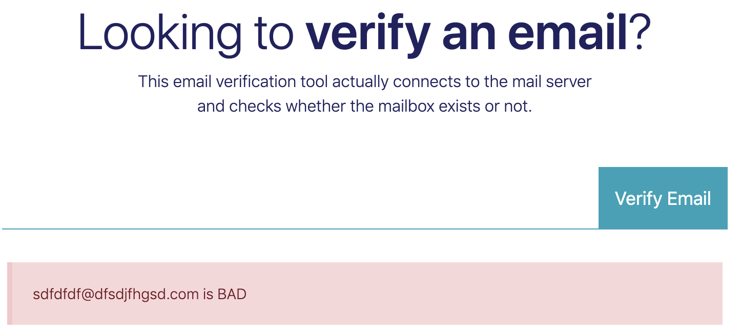 We have been using NeverBounce, but below are two screenshots of Verify-Email illustrating how it can find a “good” email and a “bad” email. Each service has its strengths and weaknesses, and you will choose one depending on your requirements, whether that being fast response times, competitive price, or advanced analytics, for example.